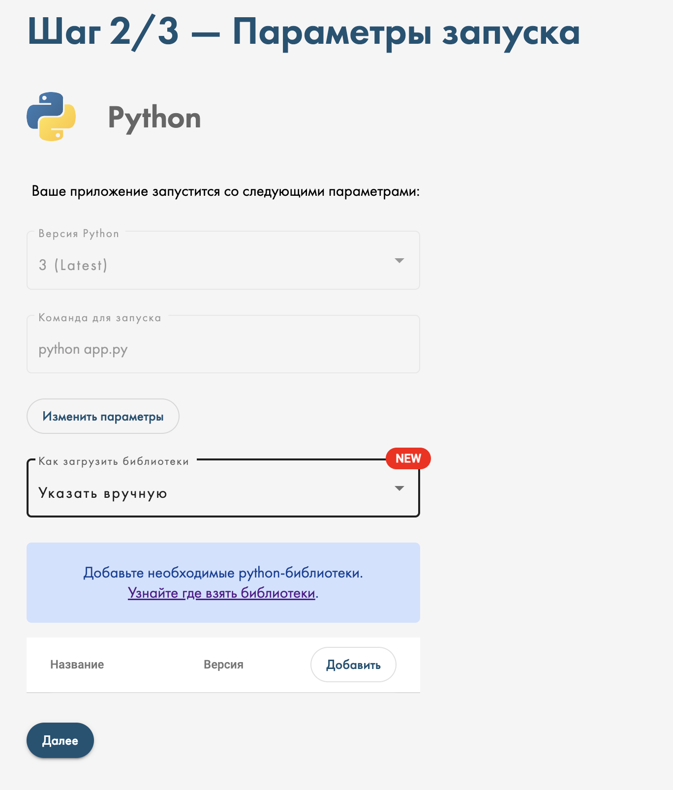 По умолчанию наш сервис пробует самостоятельно определить и скачать все зависимости, которые требуются в вашем коде с помощью библиотеки pipreqs, генерируя файл requirements.txt. Но, может быть так, что найдутся и скачаются не все библиотеки, поэтому лучше сгенерировать этот файл локально на своей машине, добавить в архив с кодом, чтобы все зависимости и нужные версии были прописаны явно и потом уже передеплоить приложение заново.